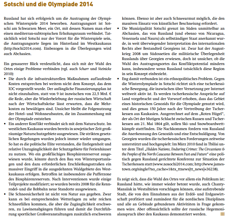 * Ethnopolitische Problematik: Ansprüche von sog. "Tscherkessen" auf Land, das für Olympia genutzt werden soll